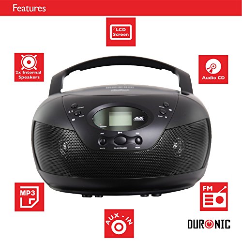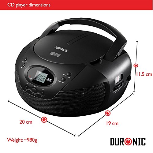 Duronic RCD008 Portable Compact Boombox CD Player | FM Radio | Headphone Jack | Aux-In Jack to play MP3 files from your Smartphone or Tablet The Duronic RCD008 model is not just a CD player; it can find your favourite radio station using a metal telescopic pole. It acts as a speaker; you can use the Aux-In jack to connect the this model to your smartphone or table so play your favourite MP3 audio tracks from your iTunes store, Spotify or any other audio app from your phone. Features: Plays audio CD and CD-R LCD Display Compact Size Lightweight Headphone Jack Aux-In Jack – Plays MP3 files Carry Handle Can be battery powered FM Radio station What’s in the box? CD player, UK mains cable, EU mains cable and Instruction manual.