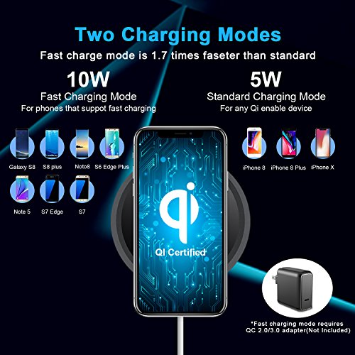 ULTRA THIN UNIVERSAL QI WIRELESS CHARGER – 10W ultra-thin quick filling base design, compatible with most QI devices like Samsung Galaxy Note 8, S8, S8 Plus, S7, S7 edge, S6, S6 edge, S6 edge plus, Note 5, iPhone X, iPhone 8/8 Plus, Google Nexus 4/5/6 and etc. You don’t need to plug your phone into a wall charger or USB port, break free of cables and get the fastest charge