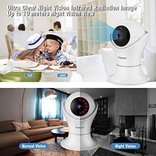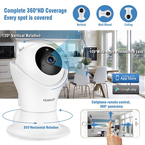 【1080P HD Panoramic Monitoring】HUMGOO full HD wifi camera with 1920*1080P resolution at 25fps,can be accessed via iOS/Android mobile Phone,and provides wider viewing angle with horizontal 355 degree(pan) and vertical 120 degree (tilt) to the full coverage of your home, you can have a HD view on your phone.
