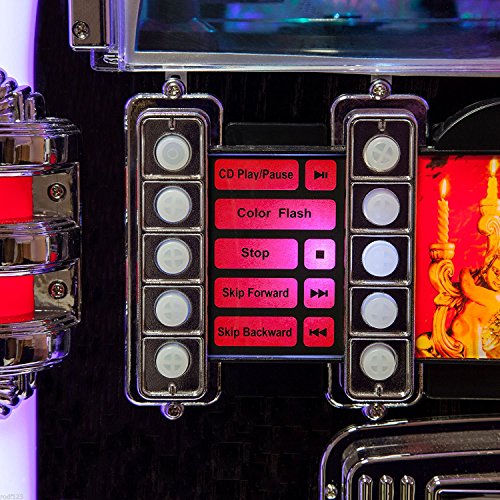 We can all agree the jukebox is a all time classic piece of equipment form the 60s. A time when fashion was sharp and music was even sharper, a time when people use to gather round the jukebox singing and dancing together. Now we have taken the jukebox and remolded it for the modern age of music by integrating a CD player, a AM/FM radio tuner and top quality speakers to make the classic jukebox sound great in your home. Not only is this jukebox guaranteed to wow all your friends and family who enters your home with its stunning Wurlitzer 1015 appearance, but it provides the ultimate home entertainment package too, making it a wonderful system to have for parties and gatherings but also for them peaceful nights at home. Features: Bluetooth Function Built-in CD player Built-in FM/AM radio tuner Woofer, mid-range and tweeter speakers 2x 40W RMS output Changing LED lights (With overide switch so you can choose your favourite colour) Mains operated 230/240 Volt Power, Supplied with remote control Has A Line Out So External Speakers Can Be Used Size: H105 x W58 x D30cm (41¼ x 22¾ x 11 ¾”)