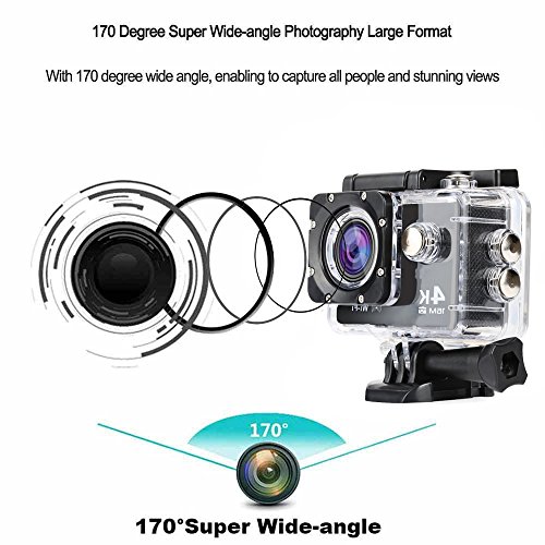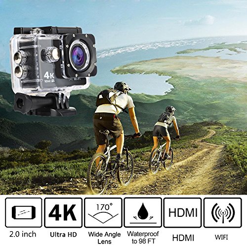 Maxesla 4K WIFI Action Camera Sports Camera Professional Video Quality High-resolution, high frame rate 4K 25fps and 2.7K 30fps video delivers distinctly smooth video. 170 degree wide angle lens allows you to shoot stunning scenes and record all your memorable adventures in a wide view angel. Easily preview videos and pictures with the built-in 2 inch LCD display on the back, allowing fast video forward/playback. Control, View and Instantly Share with Built-in WiFi Built-in Wi-Fi, allowing you to connect to the smart phone, tablet, computer and more to sharing via text, email, Facebook, Twitter, and more to your friends, family or followers. The built-in Wi-Fi can control cameras from distances of up to 50-feet (15-meters). Time Lapse and Slow Motion Capture stunning transitions like glowing sunsets and sunrises from the peak. Or, emphasize your biggest moments in smooth slow motion for more detailed elegance. You can also capture single photos, or choose Time Lapse mode to shoot photos automatically at set time intervals from2 to 60 seconds.Shooting Modes Supported: single shot/ burst / time-lapse (2s/3s/5s/10s/20s/30s/60s) Specifications:Photo:16M/12M/8M/5MResolution:4K@30FPS/2.7K@30FPS/1920*1080@60FPS/1920*1080@30FPS/1280*720@60FPSVideo Format: MP4Image Format: JPGUSB: USB 2.0Memory Micro SD: UP TO 64GB(package not include) Charge Time: About 3 hoursVideo Time: 1080P/90minWhat’s in the box: 1× Action Camera2× Battery1× Waterproof case1× Backup waterproof case cover1× Waterproof case bracket1× Waterproof case clip 1× Bike bracket1× Multifunction clip1× Camera clip1× Helmet seat1× Bandages1× Cleaning cloth1× Power adapter1× 3M stickers1× USB cable1× Bracket adapter1× Manual