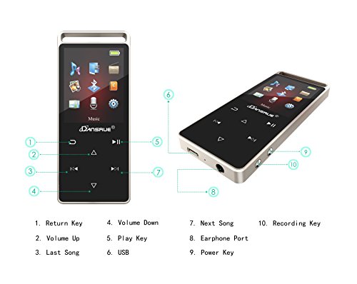 ♬ METAL CASE & TOUCH BUTTON & LOCK SCREEN KEY: All-metal case and high-gloss spray paint, with a full-glass touch button that makes the whole mp3 player crystal clear. Handling the round corners build the silky and comfortable feel, let you fondle admiringly. The high sensitive touch screen button, present music immediately with a lightly touch. It's convenient to lock the screen by pressing the power button ♬ LONG PLAYBACK TIME & FAST CHARGE: Up to 60 hours of playing time with only 2.5 hours full of charge, once charge can play 900 songs (4min/song). That means it can be used for about 30 days if it plays 2 hours a day ♬ RECORDER & FM RADIO: Not only MP3, one button recording technology can help you record fast by one step, when you need to record important information in class or meeting. Do you want to hear something else? Try FM Radio Function, you can listen to news/story/music, and it will give you more choice