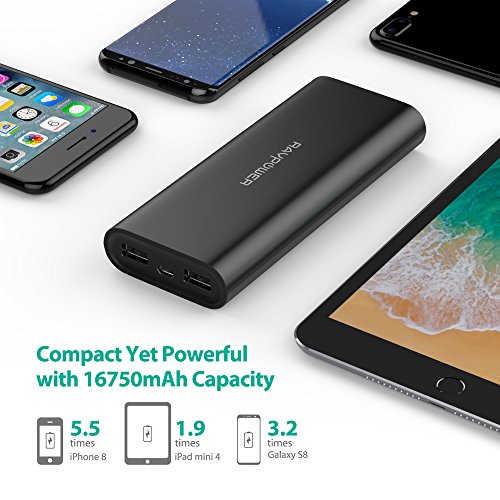 Compact Size but Mighty Power: 16750mAh of power fully charges an iPhone 8 for 5.5 times, iPad Air 2 for 1.3 times, or a Galaxy S8 for 3.2 times