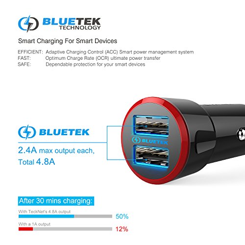 Faster and Smarter: BlUETEK smart charging technology automatically adapts suitable input current for your devices and maximizes the charging speed, up to 4.8 amps or 2.4 amps per port