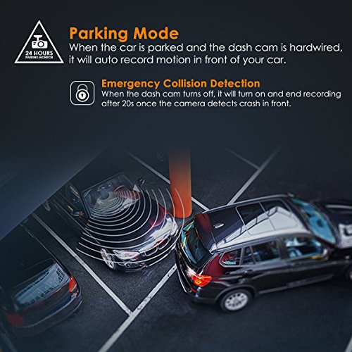 【24 Hour Parking Mode & Collision Detection】Motion activated parking mode makes the car camera to automatically record when it detects motion in front of your car, Please hardwire it or connect it with external battery source when parking. Even if no power supply and the camera turns off, it will turn on and end recording after 20s once it detects crash in front, and the recorded videos are saved and locked.