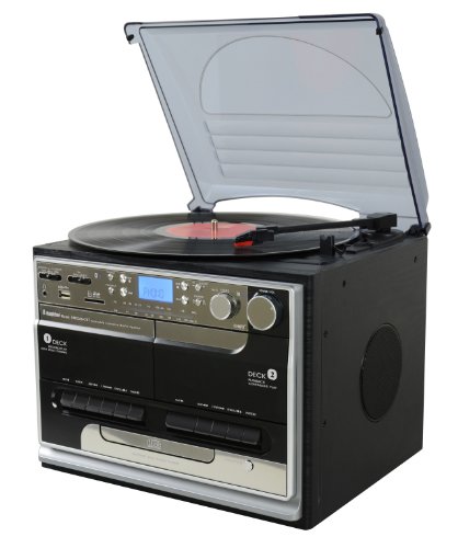 Features: (1) 3 Speed Record Turntable, plays 33, 45 & 78 rpm records, albums & singles — (2) CD Player — (3) FM Radio — (4) AM (MW) Radio — (5) Playback & Encode RECORDING to USB Stick (MP3 Format, now up to 16Gb) — (6) Playback & Encode RECORDING to SD Memory Card (MP3 Format, now up to 16Gb) — (7) TWIN Cassette Player & RECORDER, records from CD’s & Cassettes to 2nd tape deck — (8) Bluetooth